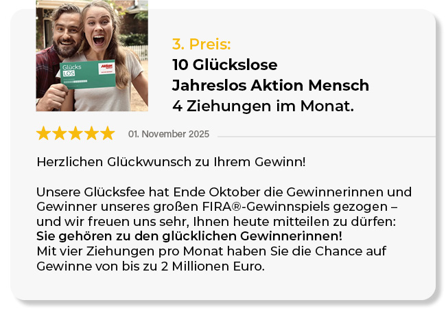 Der Rechtsweg ist ausgeschlossen. Eine Barauszahlung der Gewinne ist nicht möglich. Für technische Störungen übernehmen wir keine Haftung.